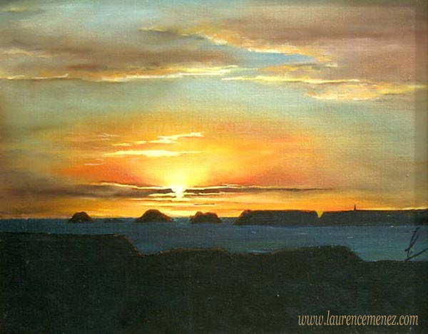 Le coucher du soleil scintille de mille feux, à moitié caché.